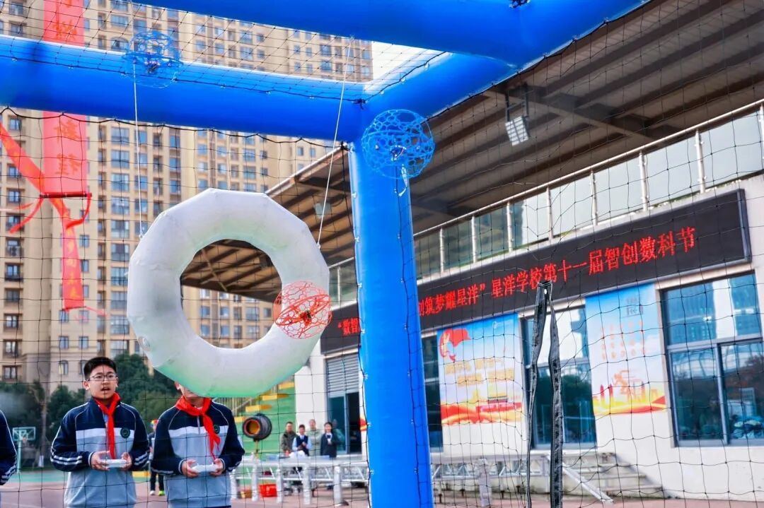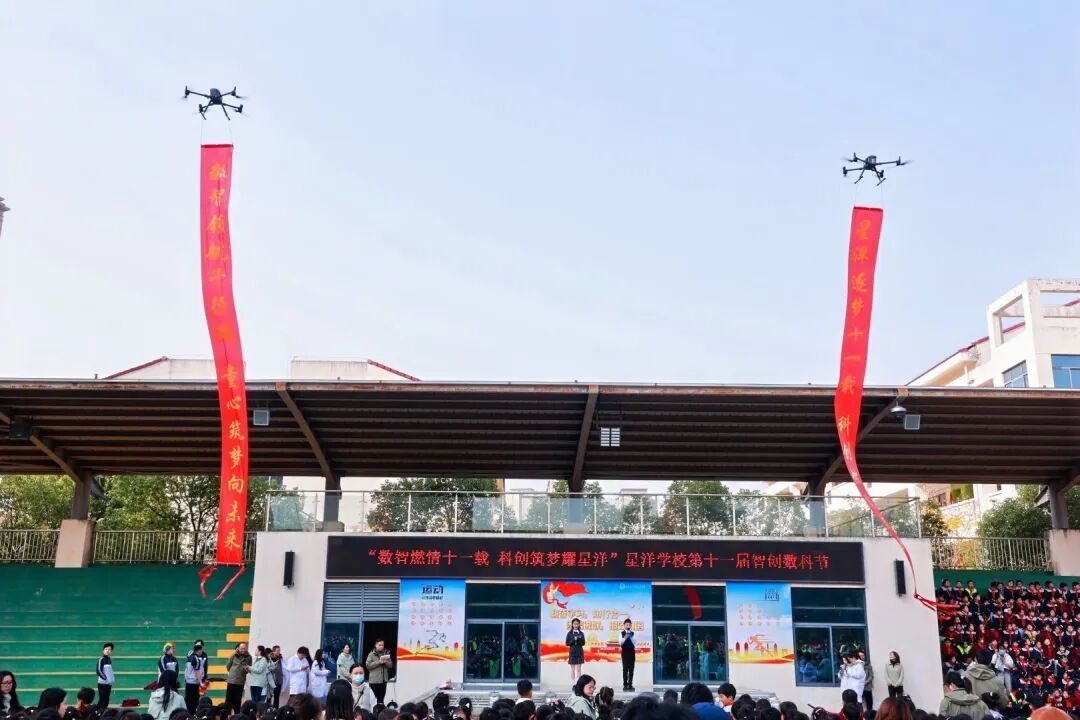 随着党委书记周良良宣布数科节开幕,无人机编队腾空而起,两条寓意深远的条幅垂天而下——“星洋逐梦十一载,科创燃情启新程”与“数智领航千径路,童心筑梦向未来”,不仅诉说着星洋人深耕科创教育的初心,更宣告着以数字智能开辟未来的使命。紧随其后的无人机足球表演,展示了人工智能与体育竞技的巧妙融合,同学们目不转睛,不时发出欢呼。