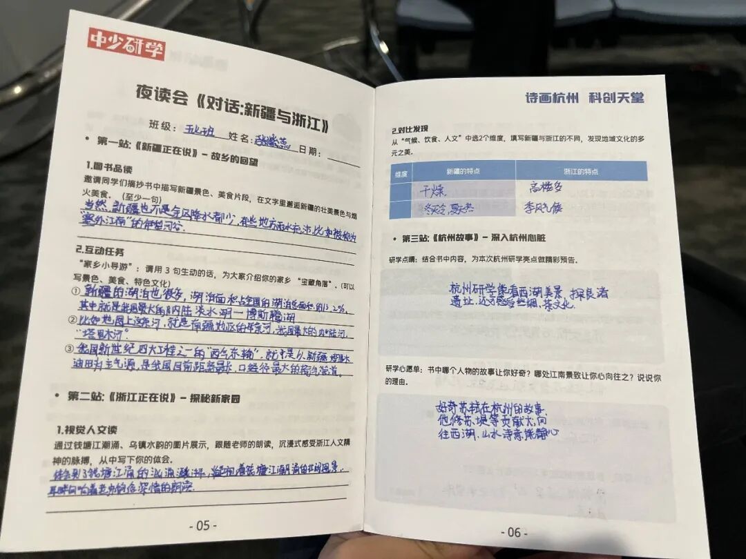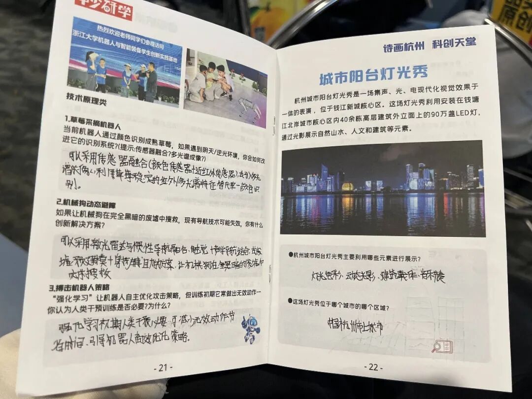 翻开小伙伴们的研学手册,每页都写满了收获。在手册最后一页,有的小伙伴画了个大大的笑脸,旁边写着:“向往西湖,感受到了知识的温度,技术发明的终点是服务生活,我希望能用眼睛看、用手触摸,让历史和科技帮助我一起长大,探索更多的奇妙。”