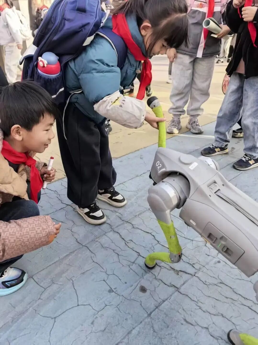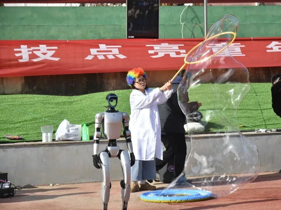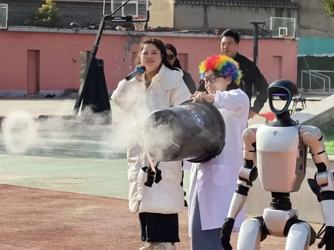 随后,一场融合视觉震撼与思维启迪的科学实验秀将全场气氛推向高潮:机器人与机器狗合作表演萌态尽显,各式可爱动作吸引大批学生围观欢呼,孩子们纷纷驻足与它们握手、合影,现场充满欢乐氛围。