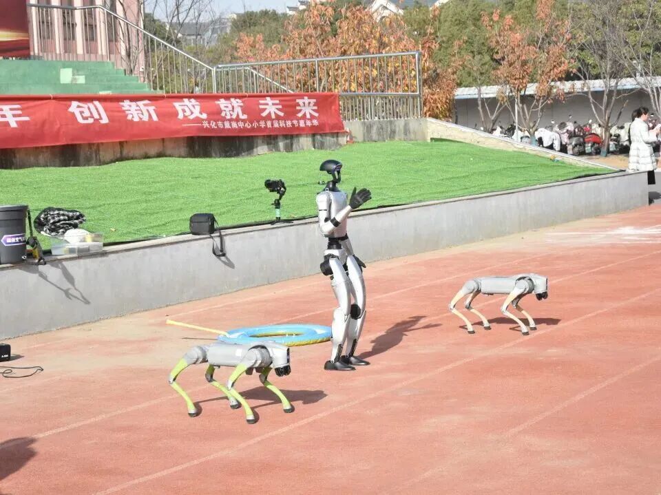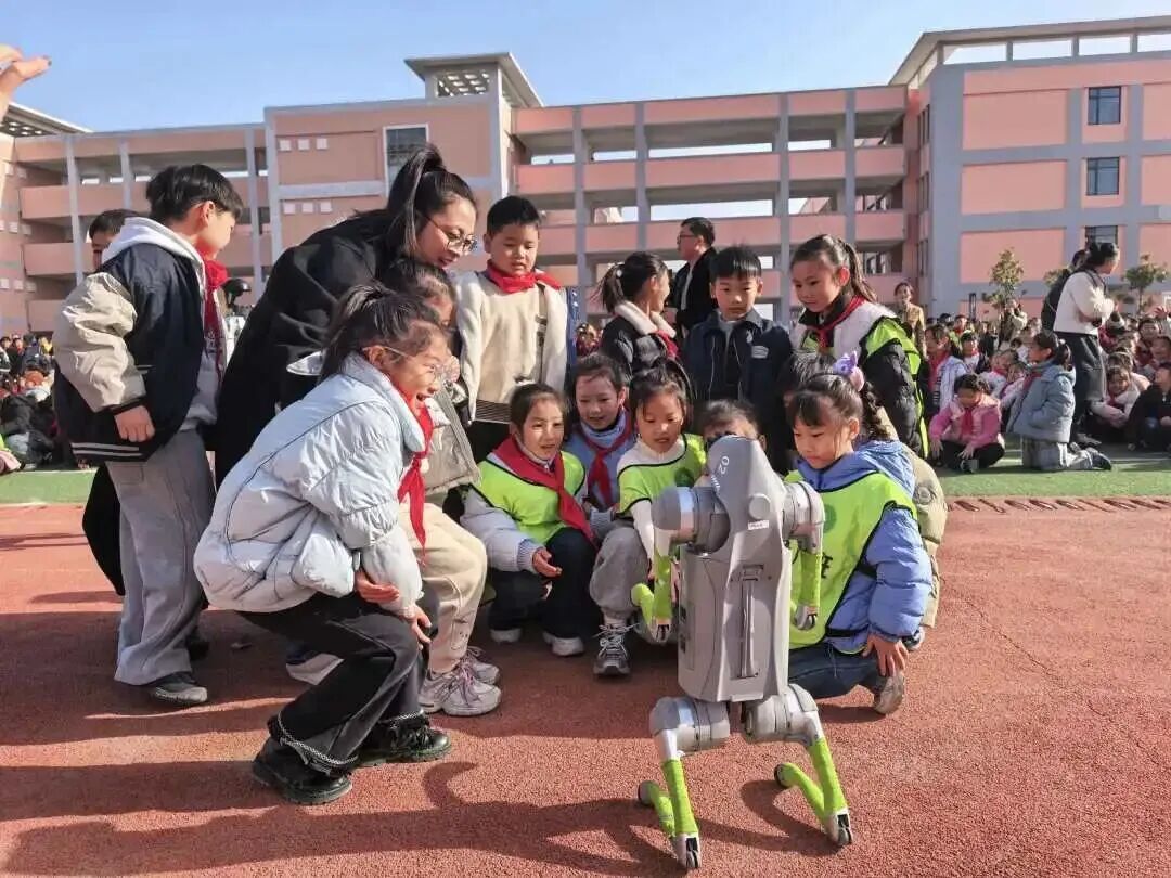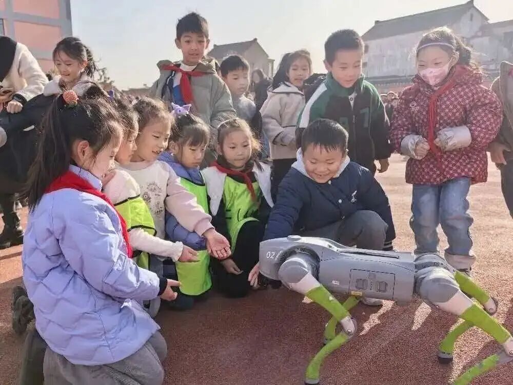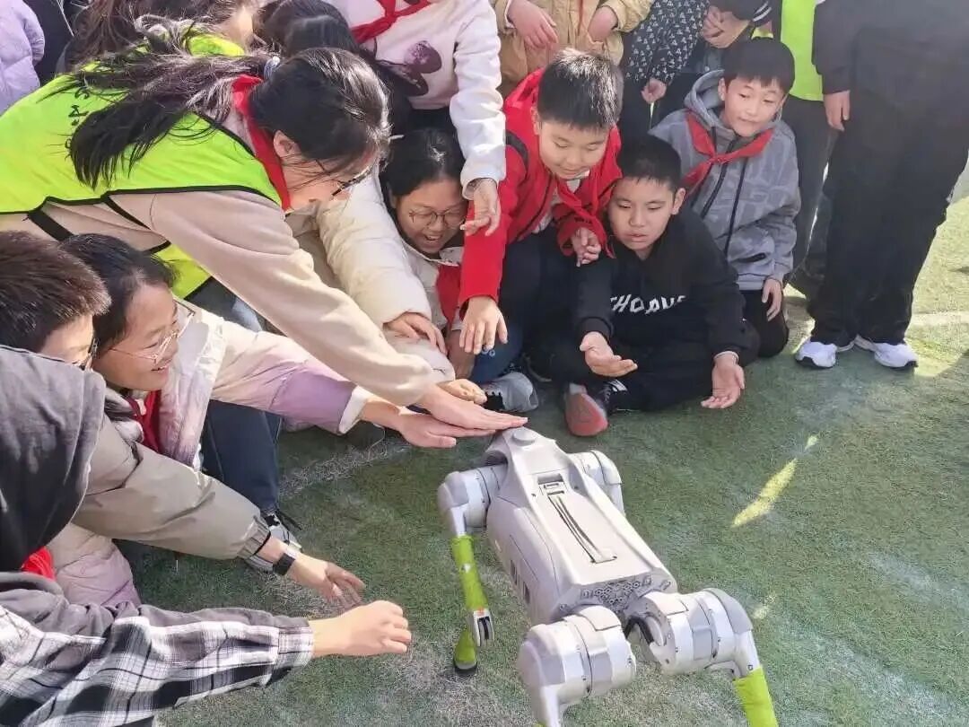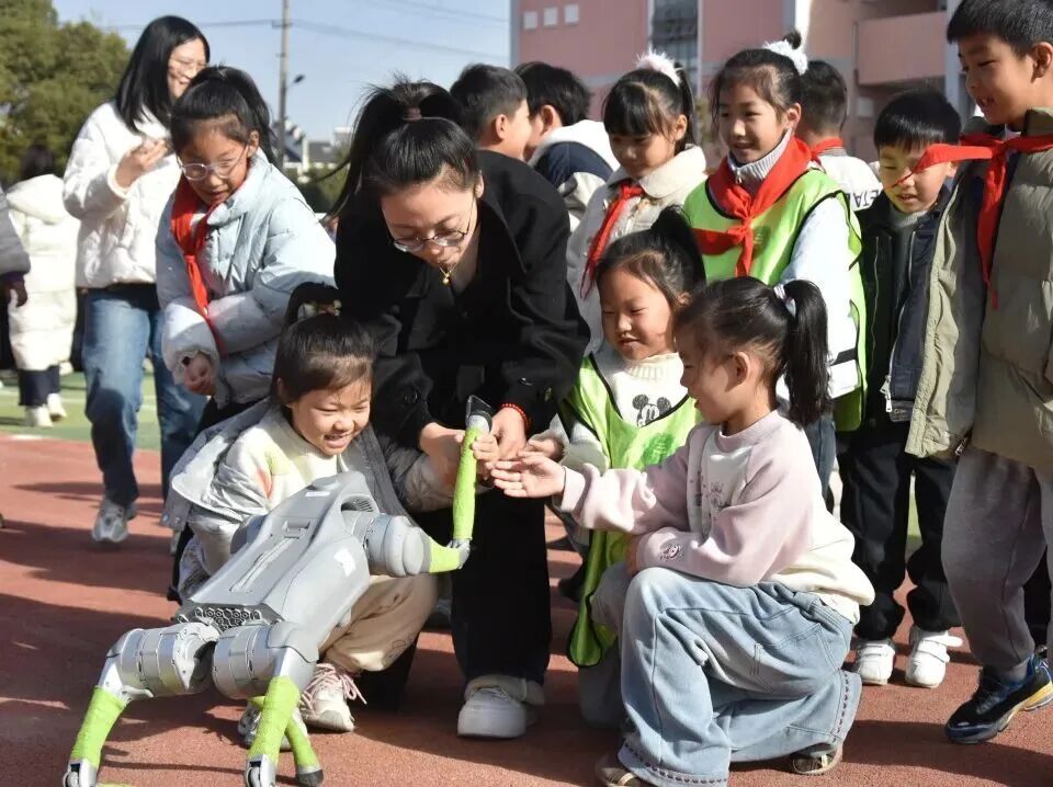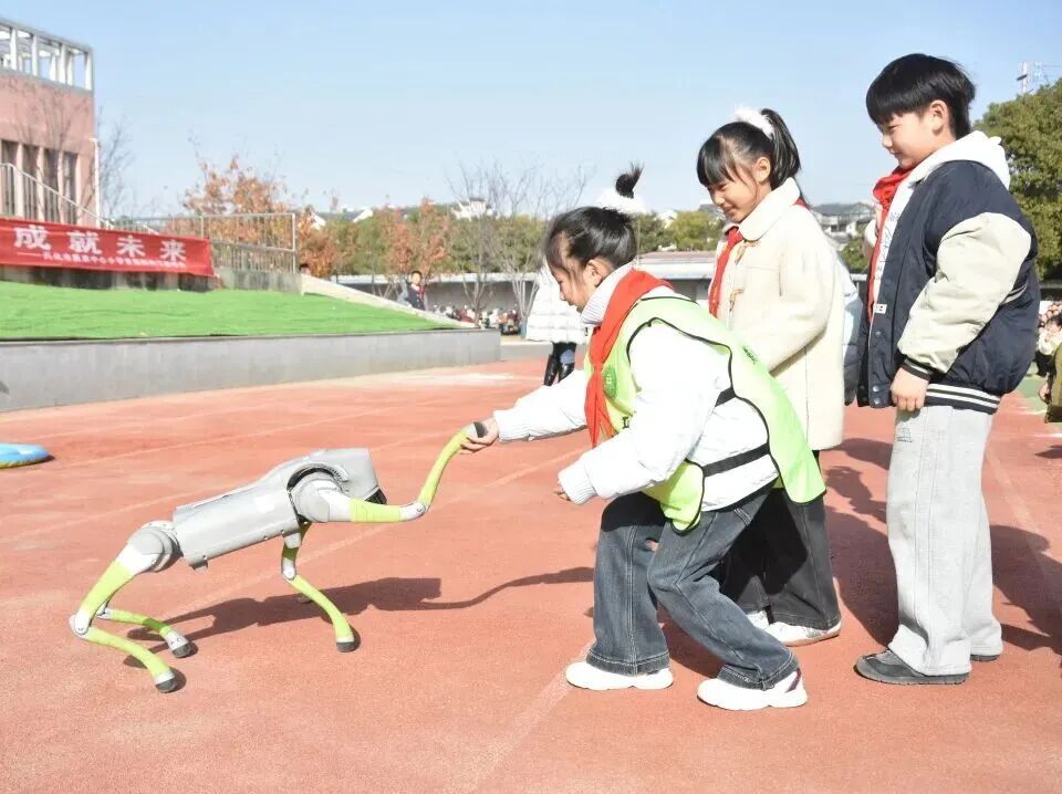 科技点亮童年岁月,创新成就未来征程,兴化市戴南中心小学首届科技嘉年华如约启幕,满校科创氛围,尽显少年探索热忱。11月28日清晨,兴化市戴南中心小学校门口洋溢着科技与欢笑的气息。憨态可掬的机器狗与灵活自如的机器人挥舞着机械臂,迎接每一位步入校园的学生。孩子们惊喜地驻足互动,有的与机器人击掌问候,有的跟着机器狗齐步前行。