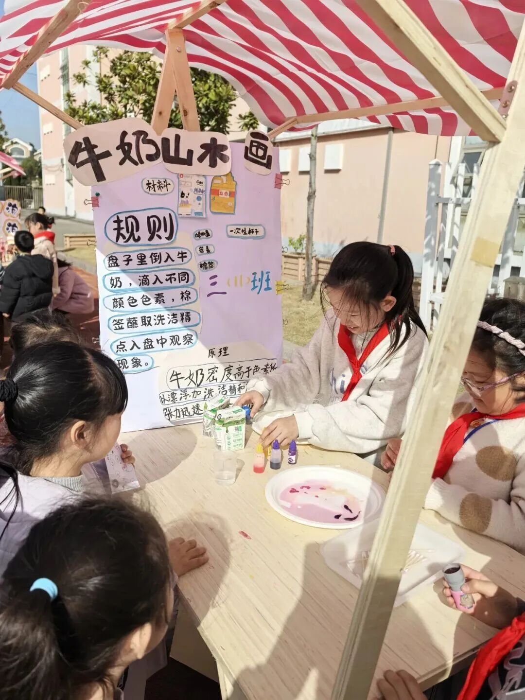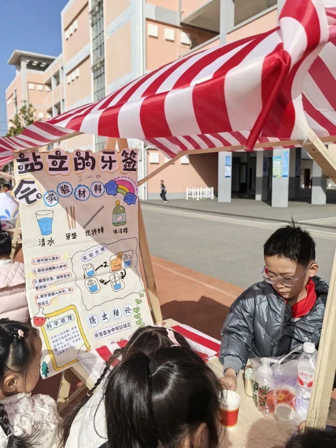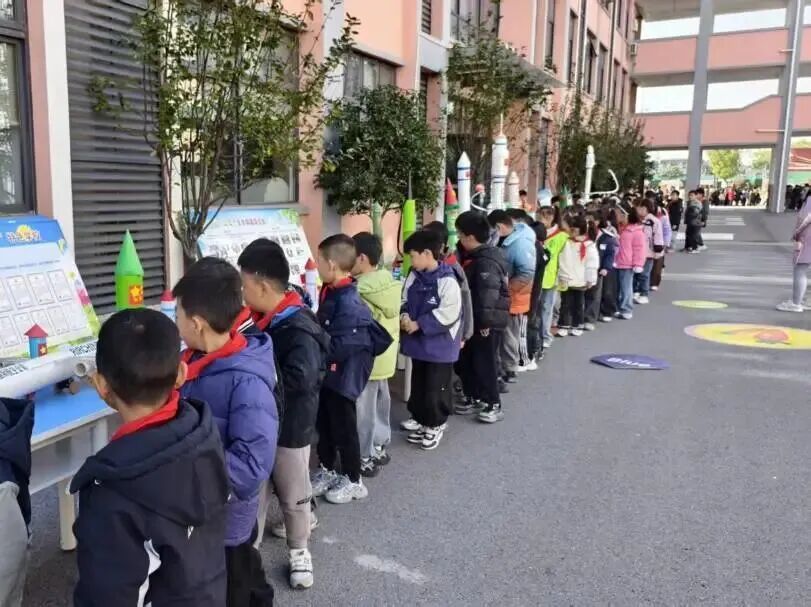 科技游园会时段,各年级分批次沉浸于充满趣味的科学乐园。三四年级搭建的实验摊位前挤满了前来挑战的小小“探索者”:有同学在“逃跑的牙签”实验摊位前屏息凝神,看着沾了洗洁精的牙签在水面迅速游动;有同学围观的“会跳舞的豆子”在醋与苏打的融合中上下翻飞,演绎着酸碱反应的活泼姿态;有同学则以“泼水成画”探索流体动力学与色彩的交融,在水墨晕染间感受科学之美……各个摊位前排起长龙,孩子们在亲手操作中体验科学原理,每一次成功的实验都引来阵阵欢呼。