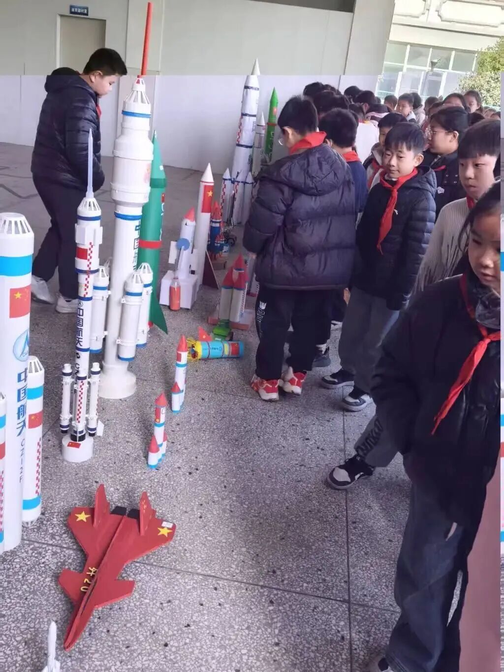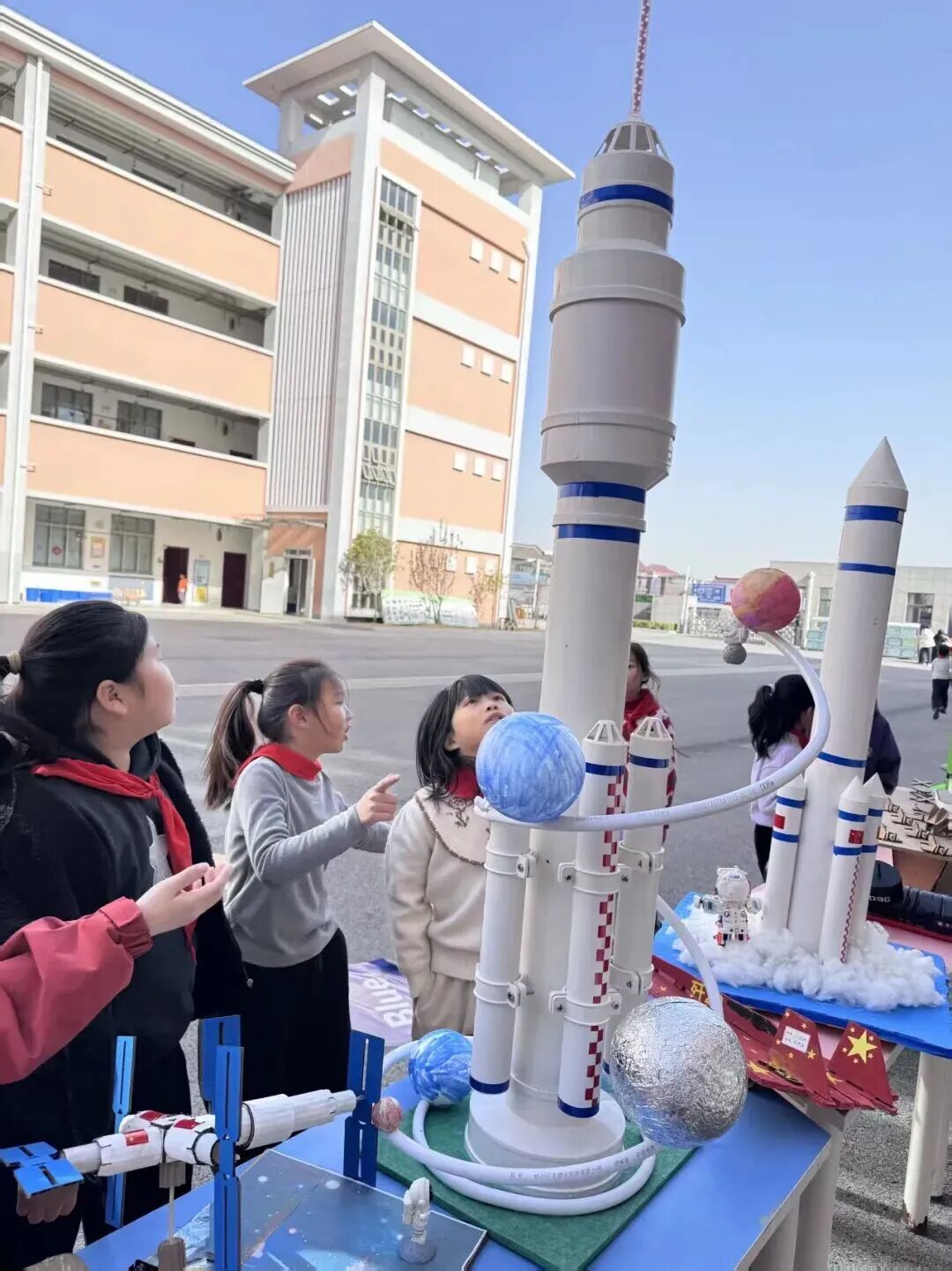 开幕式后,同学们有序移步至科技作品展示区。彩虹跑道上,学生们精心制作的“大国重器”模型展格外引人注目,每一件作品都凝聚着对祖国科技成就的深深敬意。