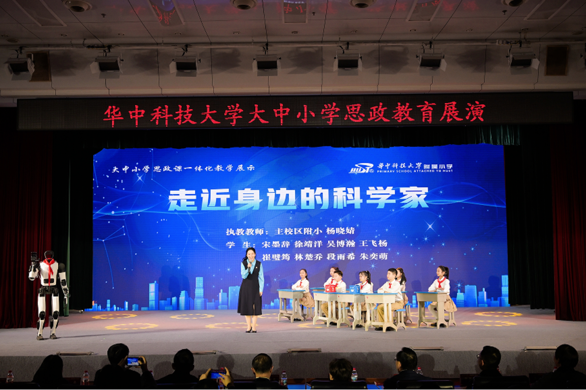 第二篇章“躬身力行,践科学探索”聚焦实践赋能。华科大同济医学院附小演绎的思政情景剧《一寸心跳一诺山河》,通过再现武汉协和医院护心跑男团队“一千五百公里争分夺秒抢救病人”的感人故事,传递了裘法祖院士“做人要知足、做事要知不足、做学问要不知足”的“三不”箴言;主校区附小呈现的思政金课《走近身边的科学家》,以智能学伴互动形式揭开科学家成长密码,让思政课堂焕发科技活力;主校区附中的情景朗诵《星辰与思维的交响曲》,则勾勒出少年学子在科学探索道路上的坚定信念与滚烫热忱。