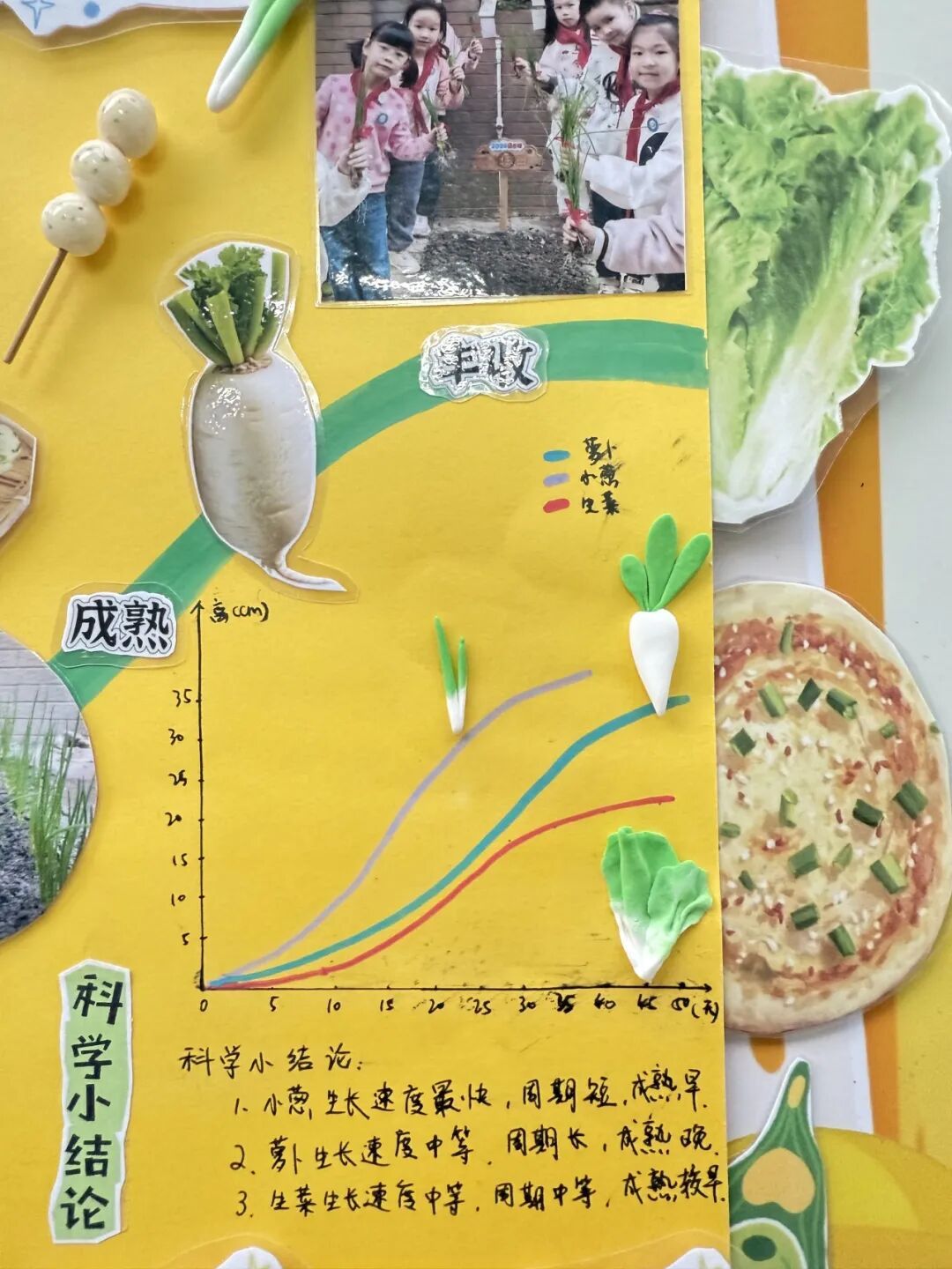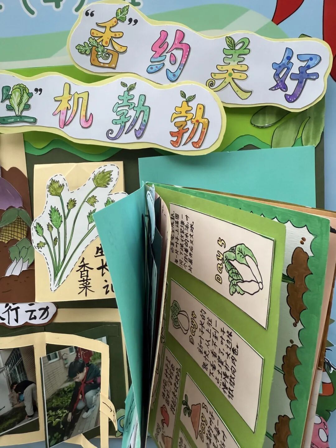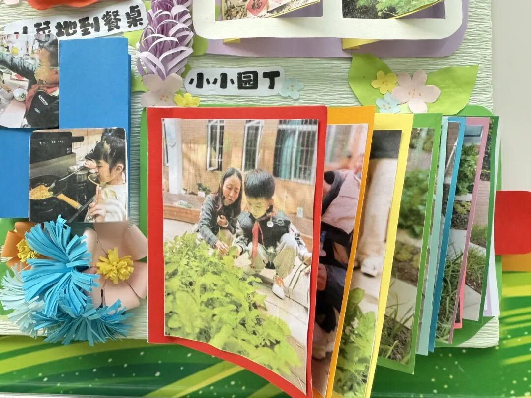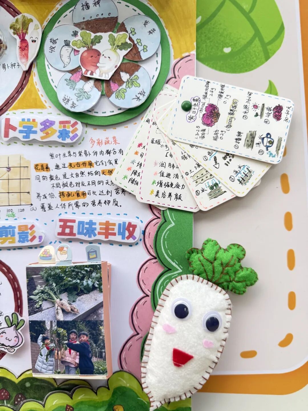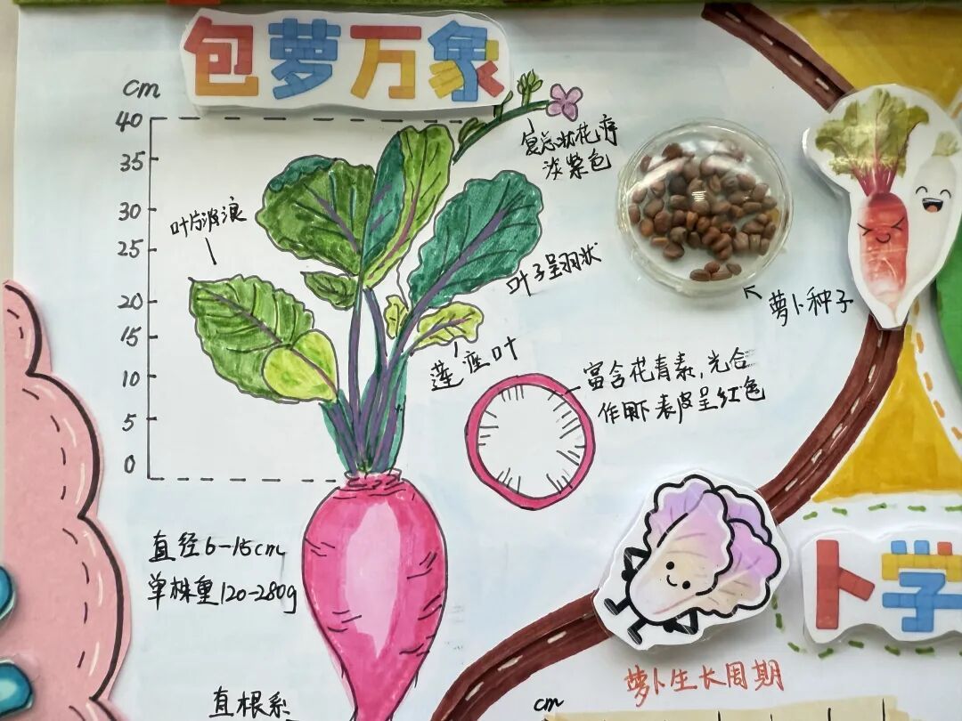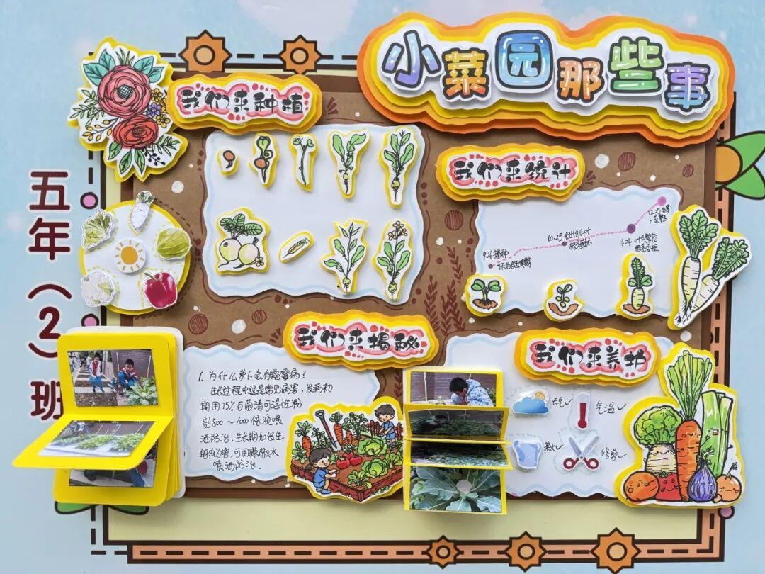 展区布置同样创意十足,科学探究与艺术气息巧妙融合。立体翻页册里,田间劳作照片搭配手写的植物防治笔记,尽显探究的细致;卡纸蔬菜、毛绒萝卜手作鲜活可爱,生长曲线图清晰呈现各类蔬菜的生长规律。立体装饰定格播种到收获的全过程,用童趣艺术让田间知识生动易懂,满溢孩子们的劳动成就感。