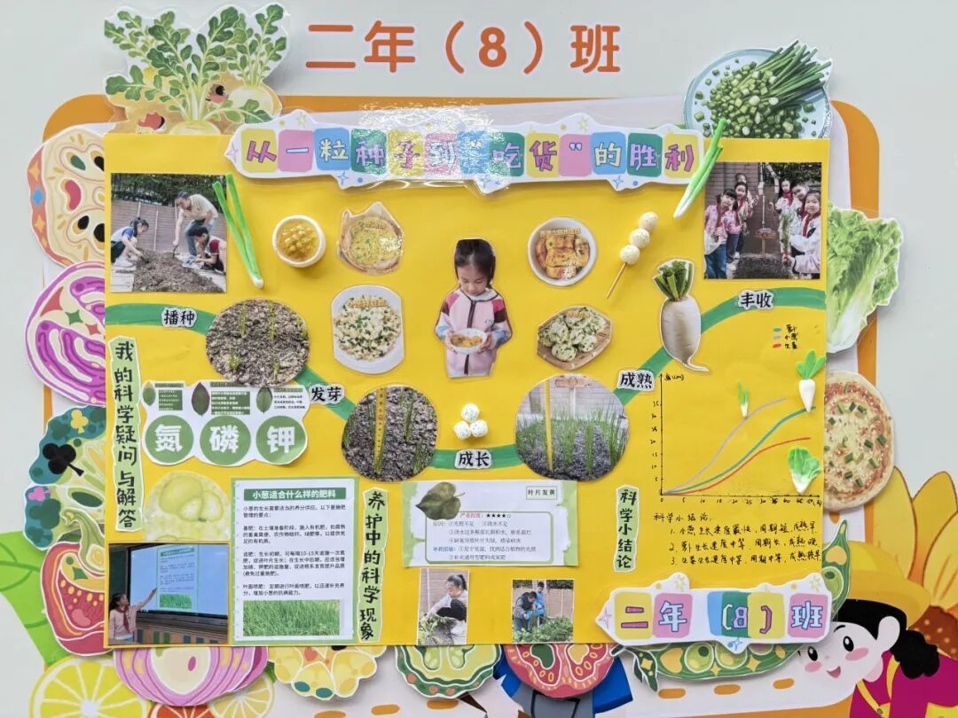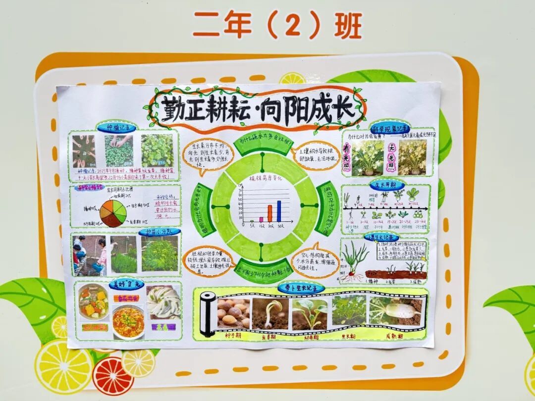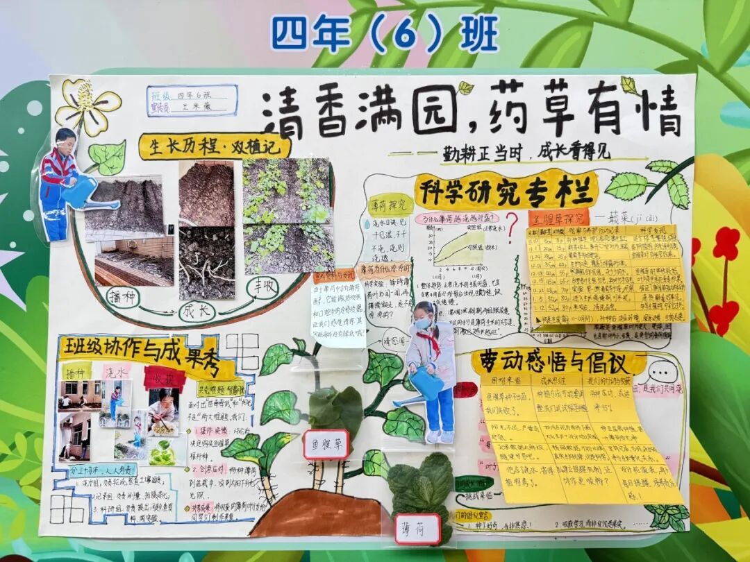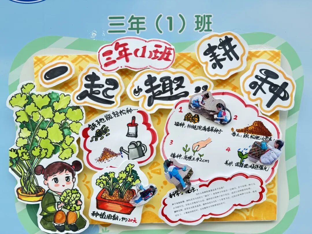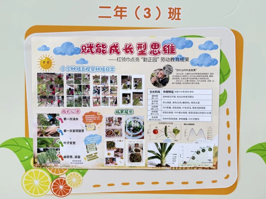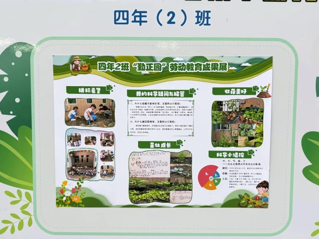 本次成果展的核心亮点,当属各班精彩纷呈的主题展板,将劳动实践与科学探究深度融合,让成长型思维在劳动中落地生根。展板以“播种—成长—丰收”为主线,串联起劳动全程的珍贵影像,更藏着同学们化身“小小科学家”的探索之旅。