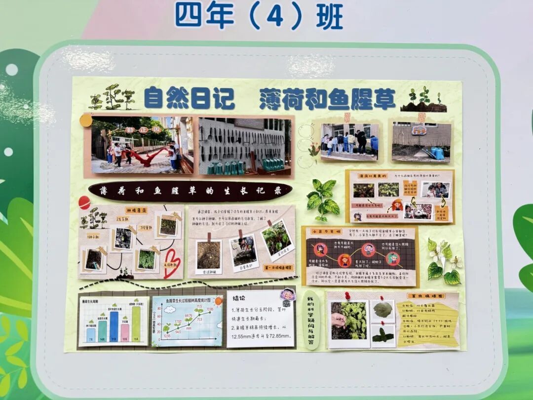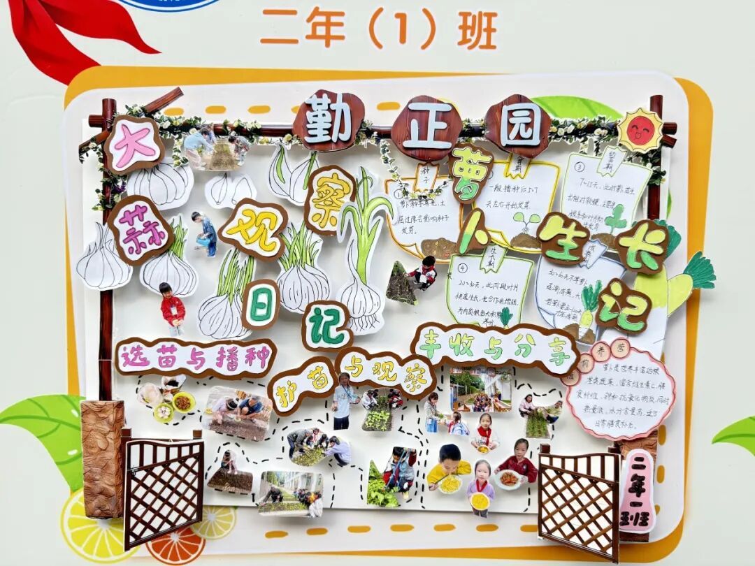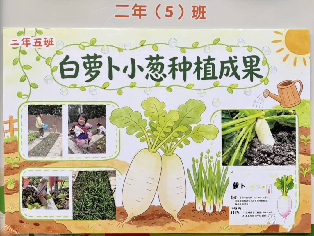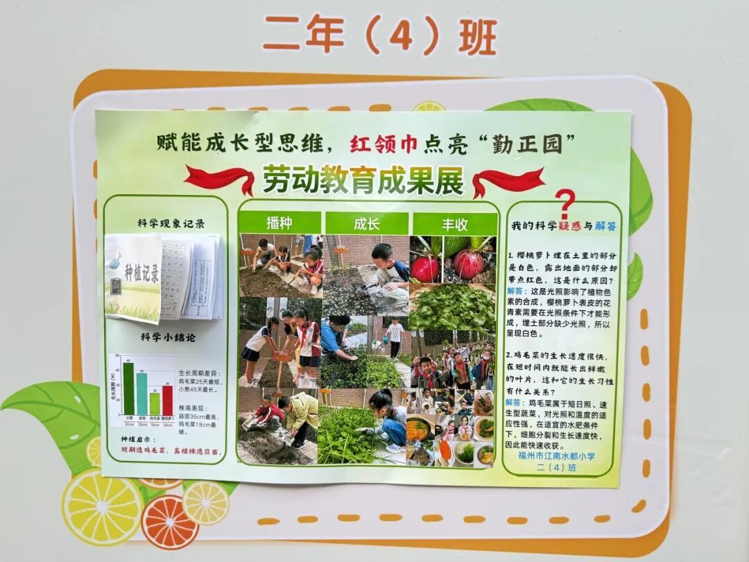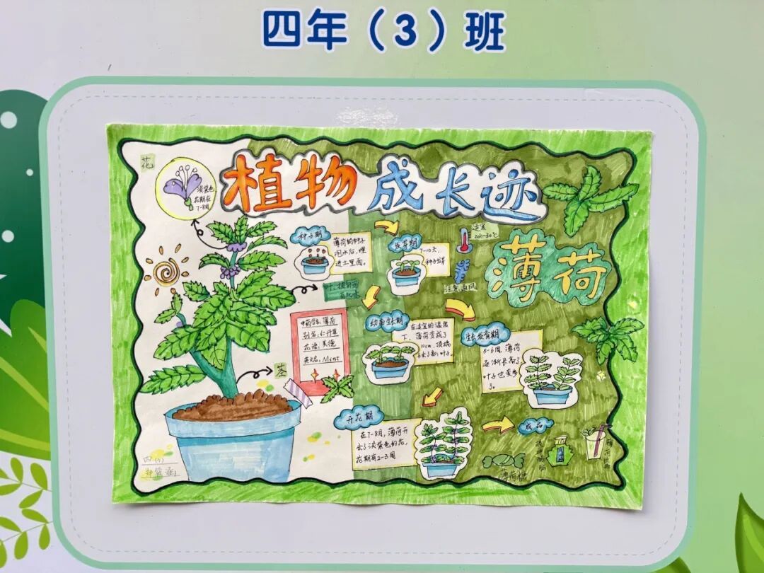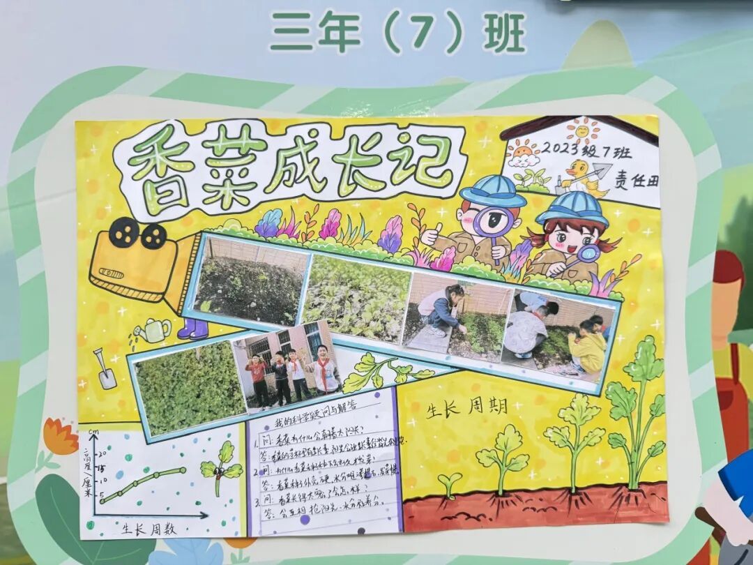 本次成果展的核心亮点,当属各班精彩纷呈的主题展板,将劳动实践与科学探究深度融合,让成长型思维在劳动中落地生根。展板以“播种—成长—丰收”为主线,串联起劳动全程的珍贵影像,更藏着同学们化身“小小科学家”的探索之旅。
