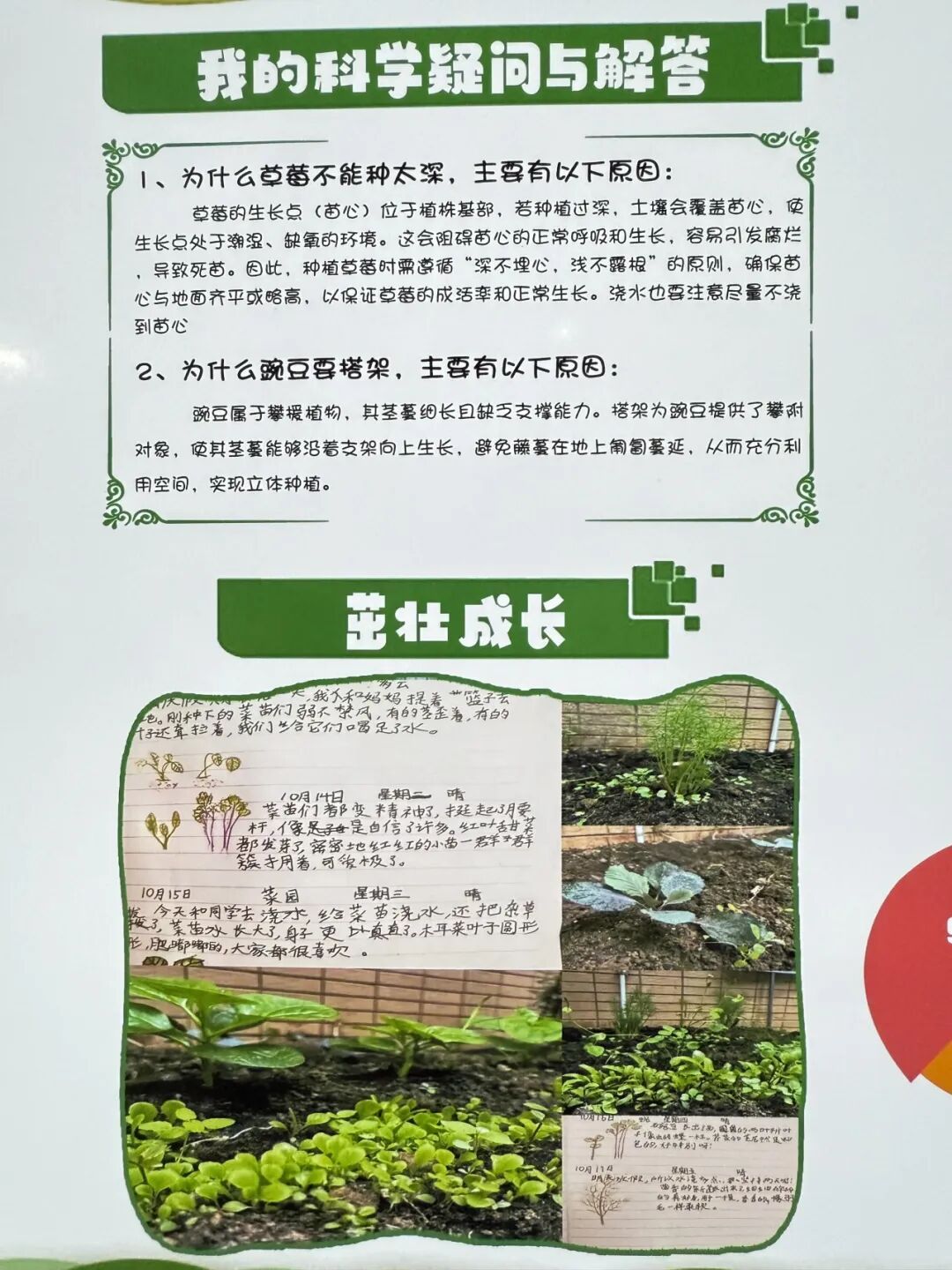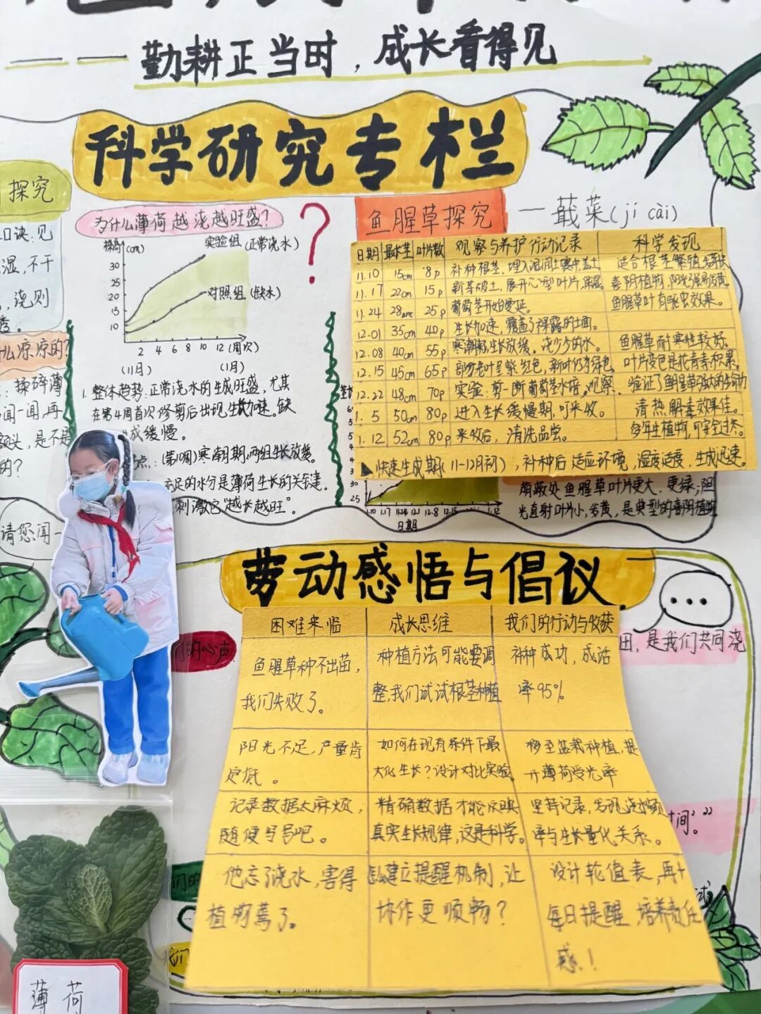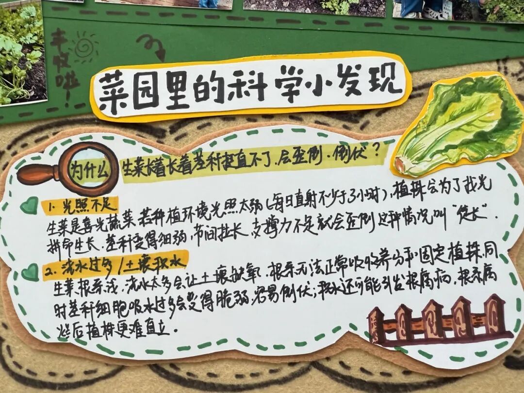 专属板块“我的科学疑问与解答”更是亮点十足,“为什么浇水太多会烂根”“植物为何会向光生长”,一个个充满童趣的科学疑问,搭配师生共同查阅资料、动手实验的验证过程,将科学课的探究思维融入劳动实践,让劳动不止于动手,更在于动脑。