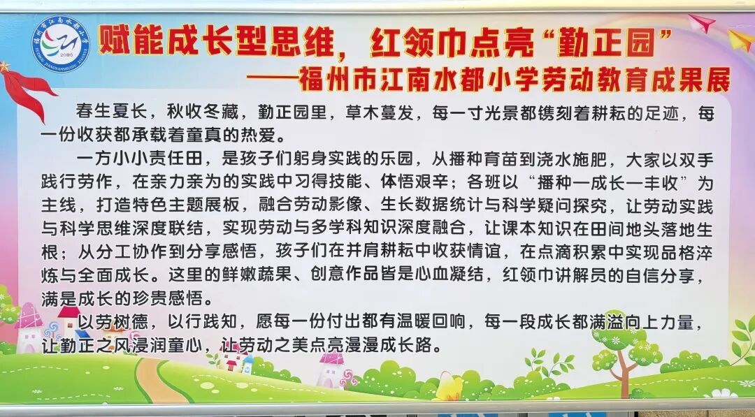 劳动润心,赋能成长。未来,江南水都小学的红领巾们将继续深耕“勤正园”这片沃土,以劳动为笔,以汗水为墨,在躬身实践中锤炼品格、增长才干,让成长型思维在劳动中持续生长,用劳动点亮精彩童年,用勤奋书写美好未来!