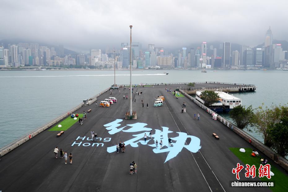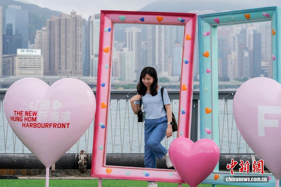 图为市民与游客在红磡新海滨“打卡”拍照。