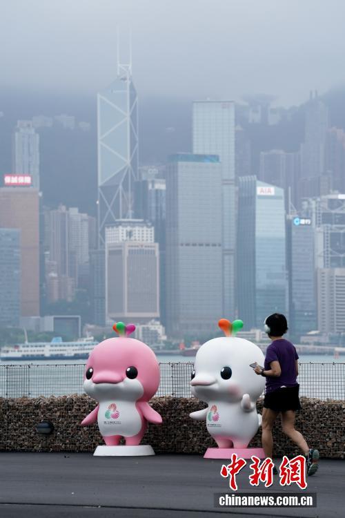 图为市民跑步经过设置在红磡新海滨,被网民称为“大湾鸡”的十五运会和残特奥会吉祥物“喜洋洋”“乐融融”艺术装置。