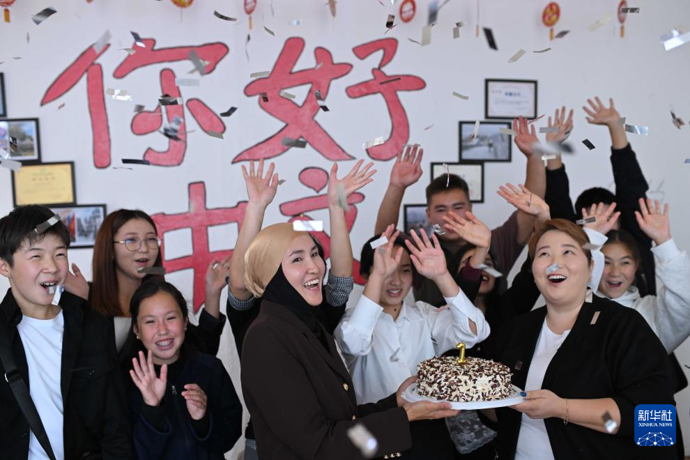 9月22日,在吉尔吉斯斯坦伊塞克湖州卡拉库尔市,库巴内奇别科娃(前右)和同事、学生们共同庆祝中文培训中心成立一周年。新华社记者 李任滋 摄
