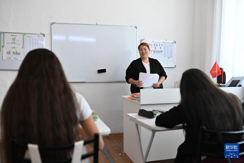 9月22日,在吉尔吉斯斯坦伊塞克湖州卡拉库尔市,库巴内奇别科娃在中文培训中心授课。新华社记者 李任滋 摄