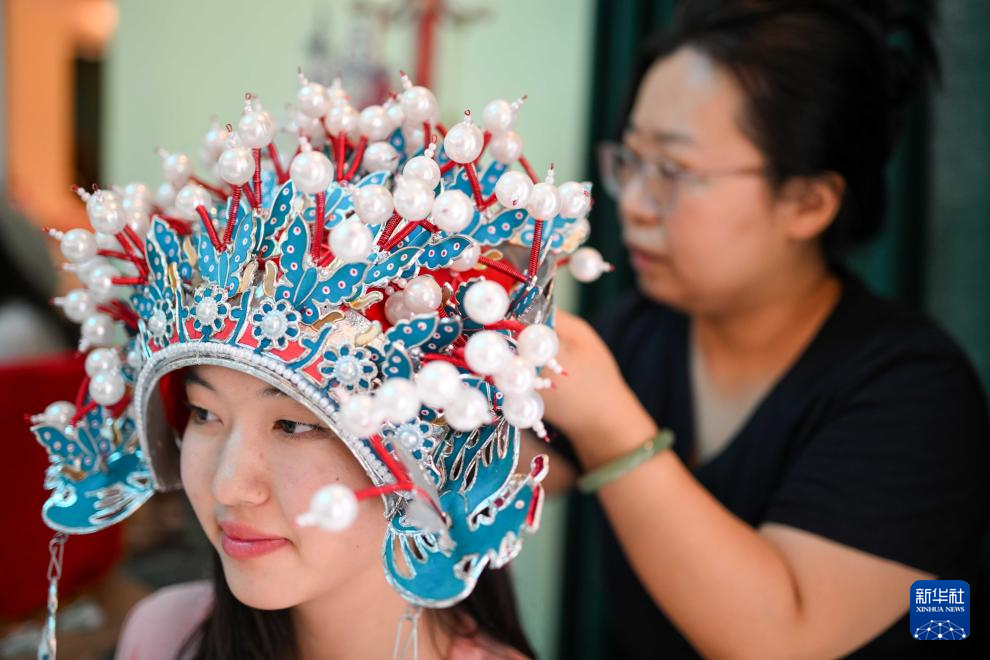 9月18日,在吉尔吉斯斯坦奥什国立大学孔子学院,一名教师为学生佩戴晚会活动上用的头冠。新华社记者 李任滋 摄