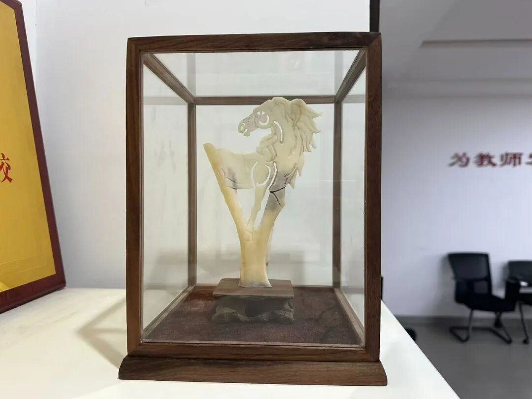在互赠礼品环节,丁香路小学精心准备了骨雕艺术作品,该作品以蒙古马为原型,生动诠释了“吃苦耐劳、一往无前”的蒙古马精神,这份礼物承载着北疆文化的豪迈与坚韧,也传递着两校深厚的情谊。