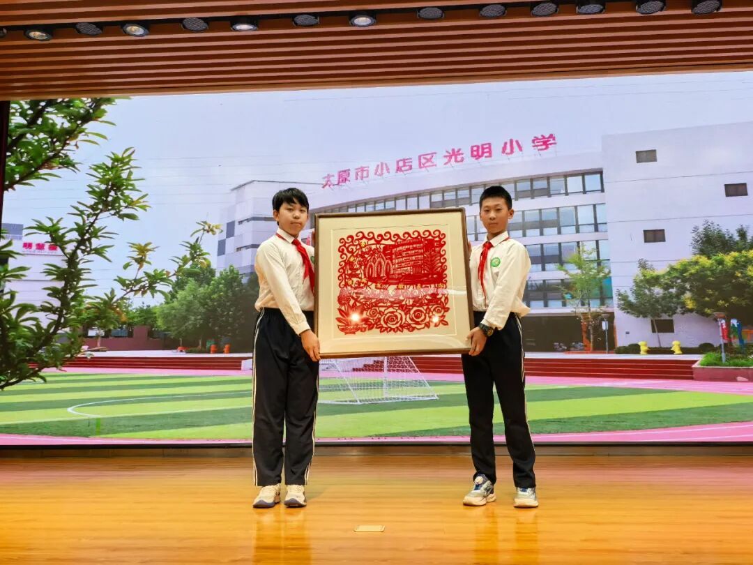 光明小学以山西非遗“晋地剪纸”为载体,开发“纸韵匠心”校本课程,创作以光明小学校园景观为核心的剪纸作品赠予丁香路小学,既定格了两校情谊的“连接点”,又展现三晋文化“细微处见匠心”的底色,成为非遗传承与校际团结的双重见证。