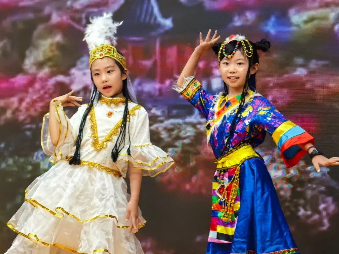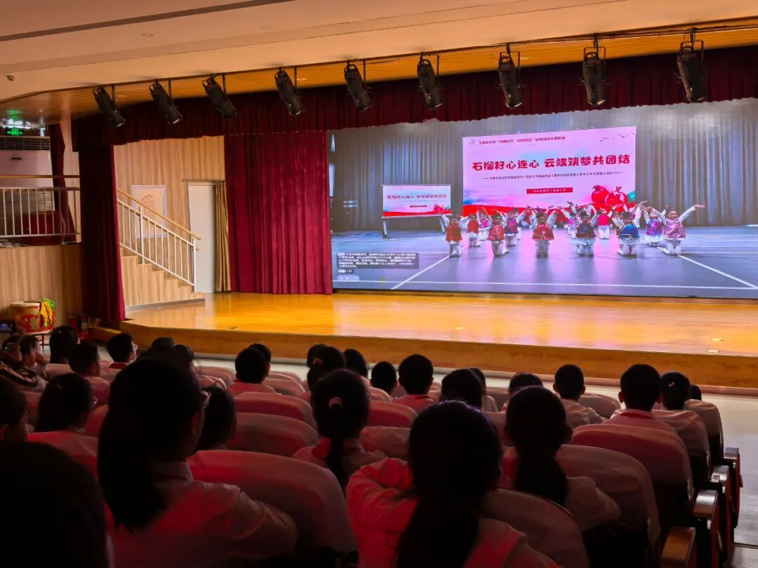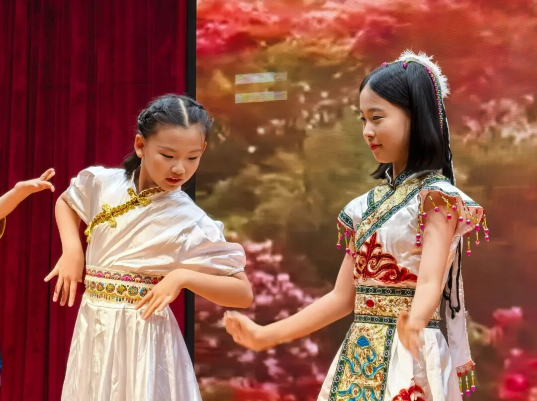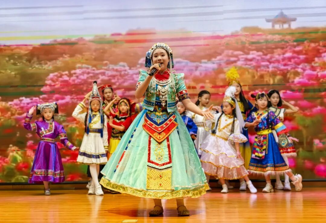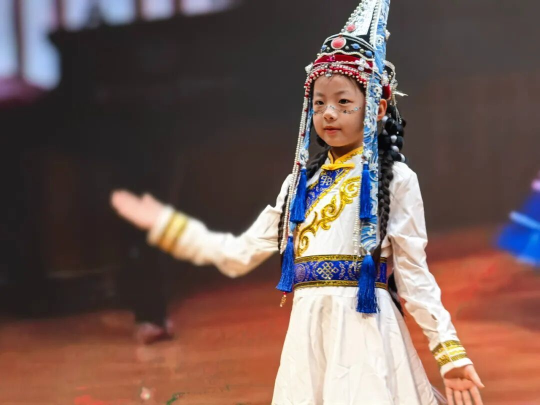 在双方学生交融互动环节,精彩节目轮番上演。光明小学的《民族服饰秀》绚丽多彩,一件件服饰承载着民族文化的记忆,如草原清风与黄河浪花在舞台相遇。