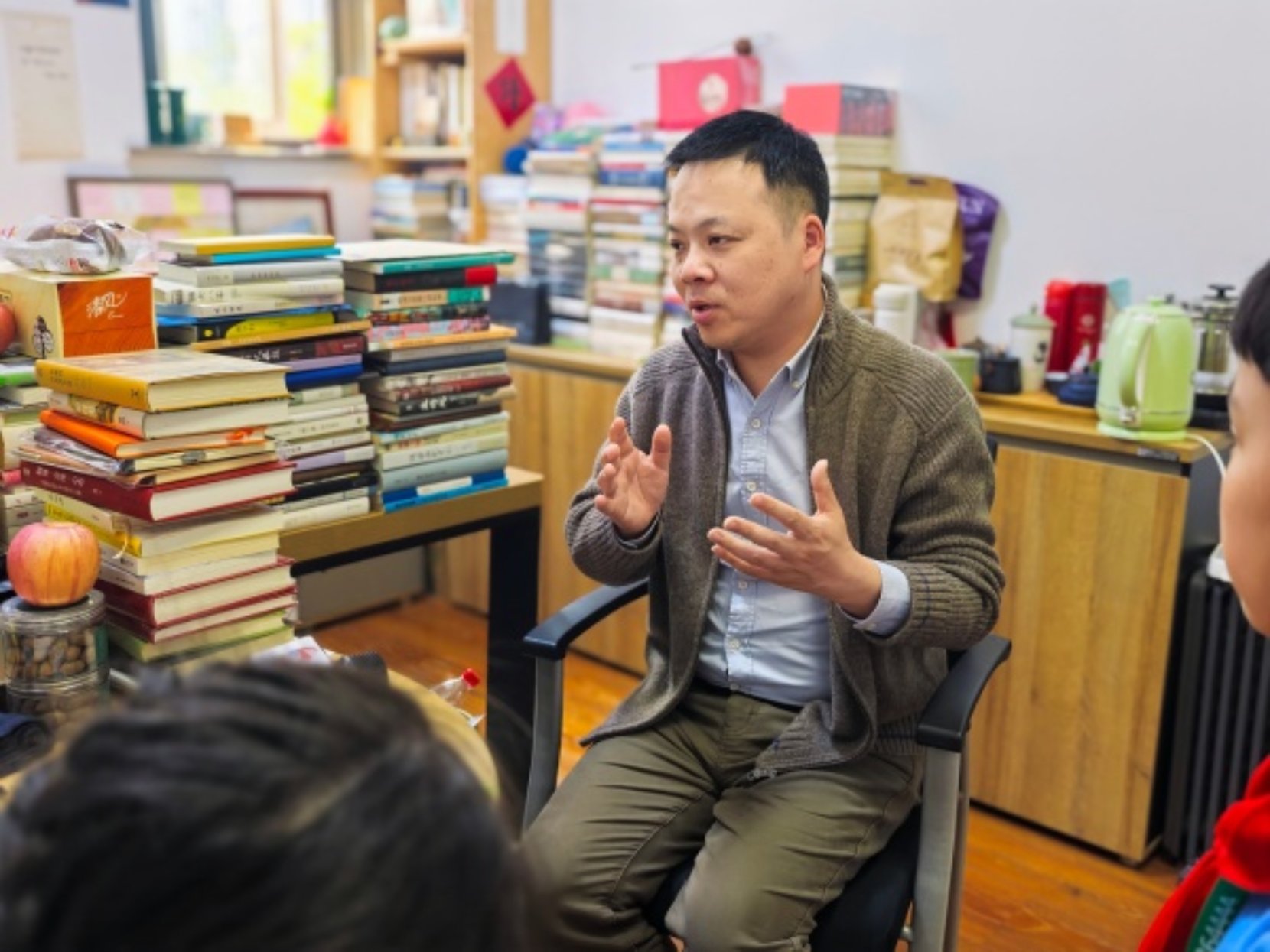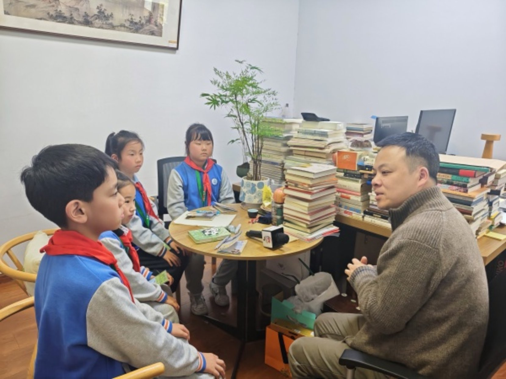 初次见到偶像,小记者们有点紧张,在带队老师的引导下,大家分别向徐海蛟老师问好。随后,小记者们落座,围绕日常阅读困惑、课余读书趣事、习作创作难点、书香陪伴成长等同学们都非常关注的话题,与徐老师开始了交流。一开始,小记者们便问道了徐老师童年读书的故事。徐老师回忆说,自己小时候可阅读的书籍十分有限,第一本课外书是在邻居家床底下偶然发现的——这本无封面、无封底、前四十多页缺失的《铁道游击队》,虽残破不堪,却让他一读便深受感动,也在那时候的心中种下了一颗阅读与文学的种子。